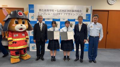 弘前地区消防事務組合エンブレム・ロゴタイプのデザイン制作の前に連携第1弾として「広報誌題字デザイン」を行なっています。令和6年度卒業生探究デザイン選択の生徒数名が手がけ、採用は殿川愛佳さん(採用時3年生)でした。令和7年2月10日(月)、弘前地区消防事務組合消防本部で感謝状贈呈式が行われました。題字は今後末永く活用される予定です。